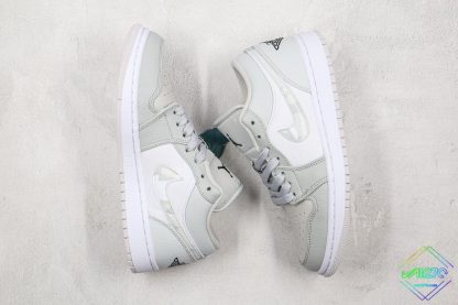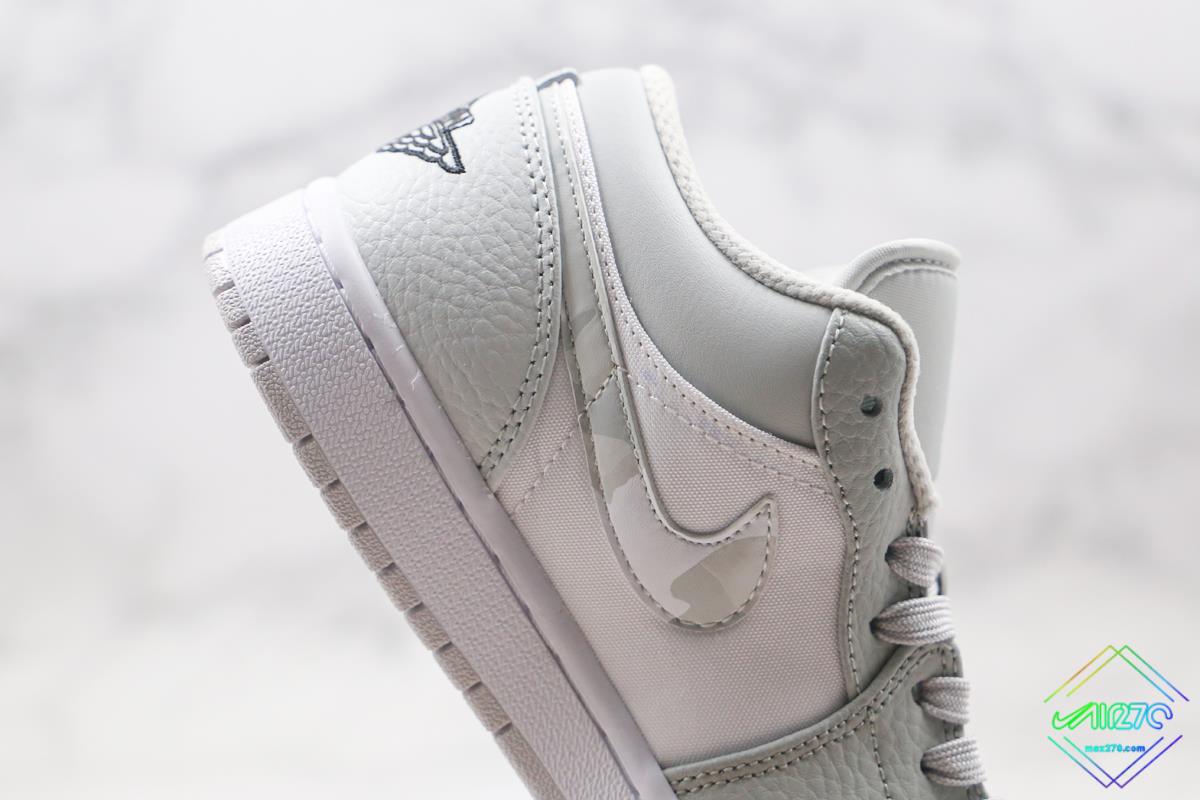 This Air Jordan 1 Low features a white base overlaid with light grey tumbled leather panels. Midfoot underlays deviate from the model’s standard leather build in favor of a canvas-like material. Jordan Brand-specific branding interrupts the light palette with its black composition, while profile logos boast a greyscale camo pattern. Underfoot, sole units don’t partake in the experiments, opting in for a clean white midsole/grey outsole combination.