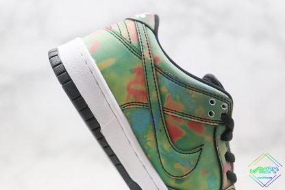 The Civilist SB Dunk Low features a Black heat-activated upper with hidden thermal imaging in multicolored tones when exposed to heat, and turns back Black when exposed to cold. Civilist label on the lateral atop a White midsole and Black rubber outsole with graphic insoles completes the design.
