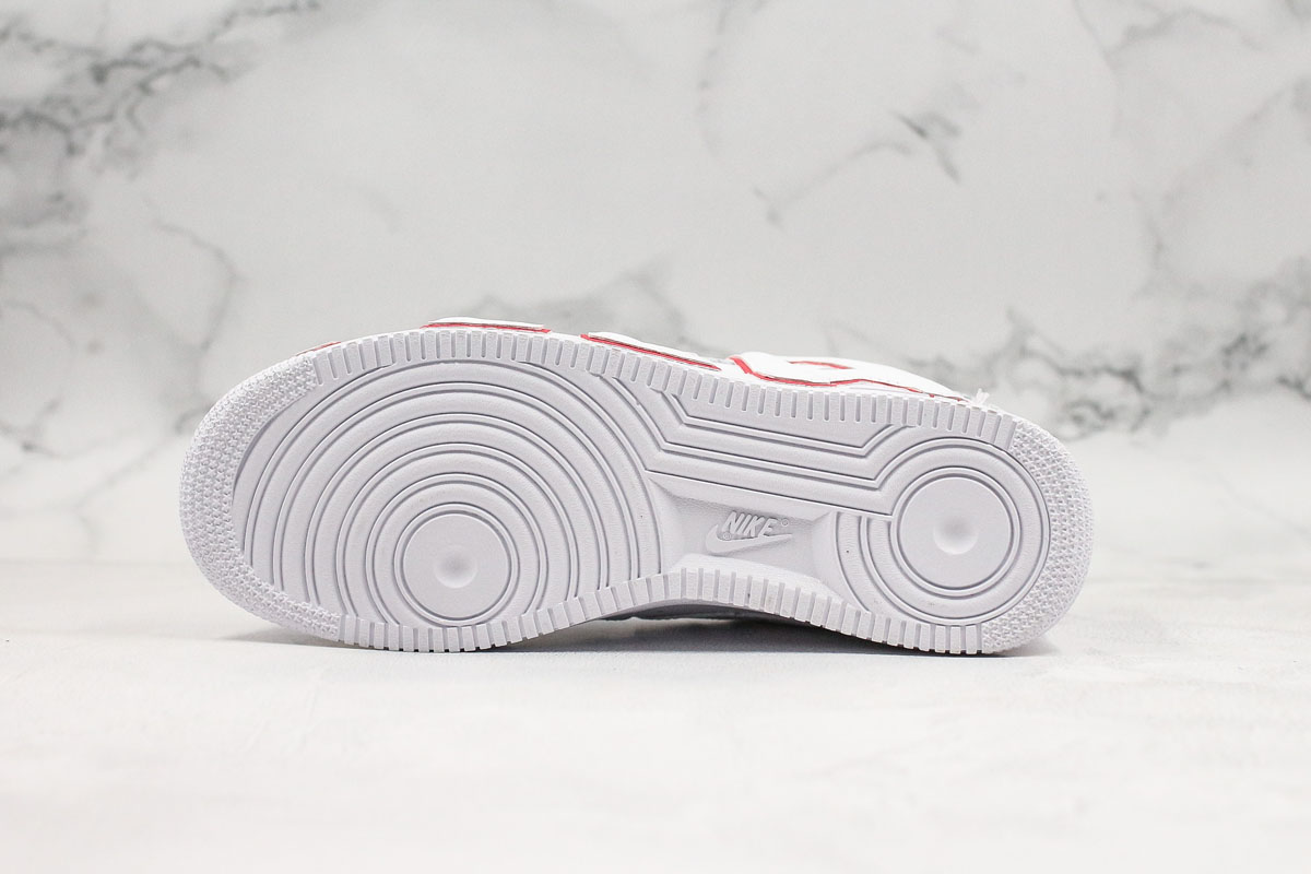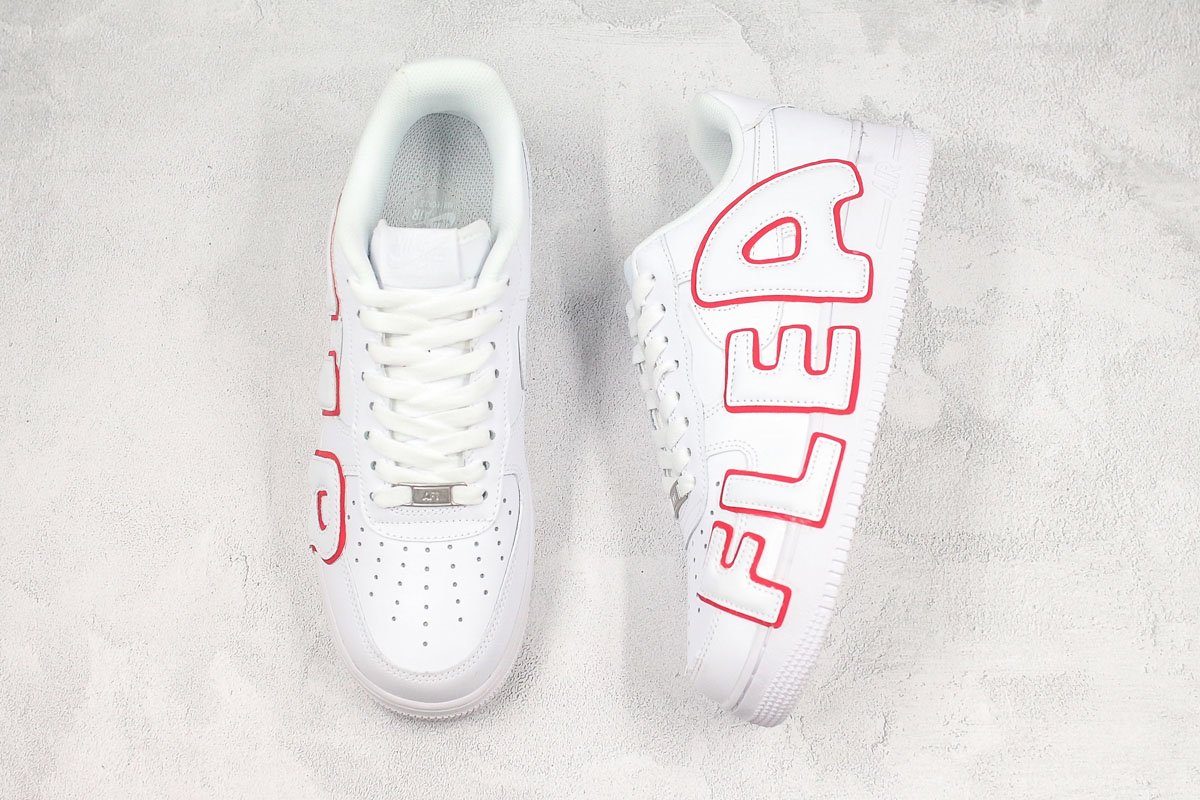This Nike Air Force 1 features a clean White leather upper highlighted with oversized lettering in Air More Uptempo styling on the sides that read “AIR” on the right shoe, and “FLEA” on the left.