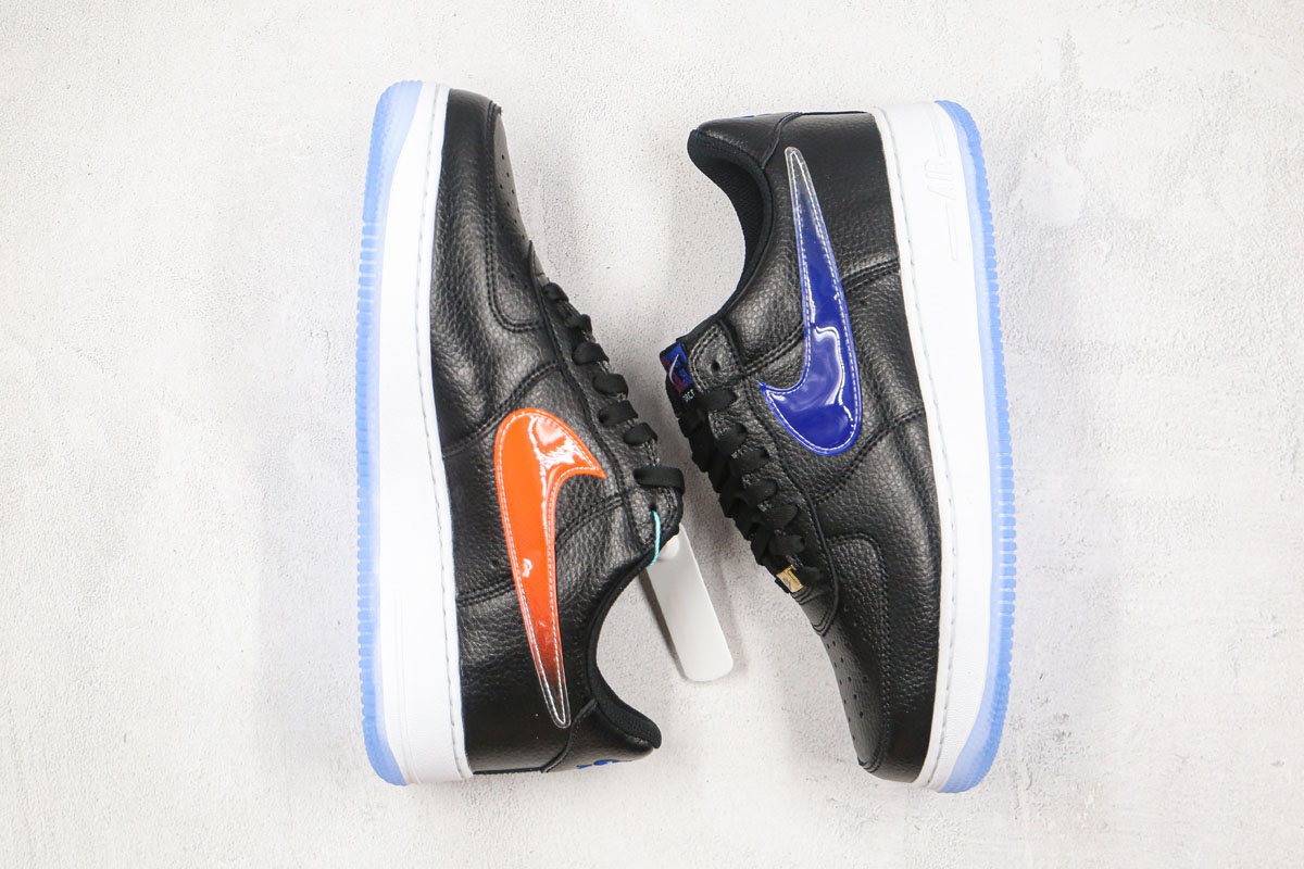 Dressed in black leather, translucent gradient Nike Swoosh logos highlight the upper with a blue design on the outer portion as well as an orange theme on the inner sides. Blue and Orange accents are then added to the gradient Nike x Kith tongue logos as well as an NYC logo on the ankles and a Kith Air logo on the heels. A white midsole and icy rubber outsole then add the final touches to the crisp new offering.