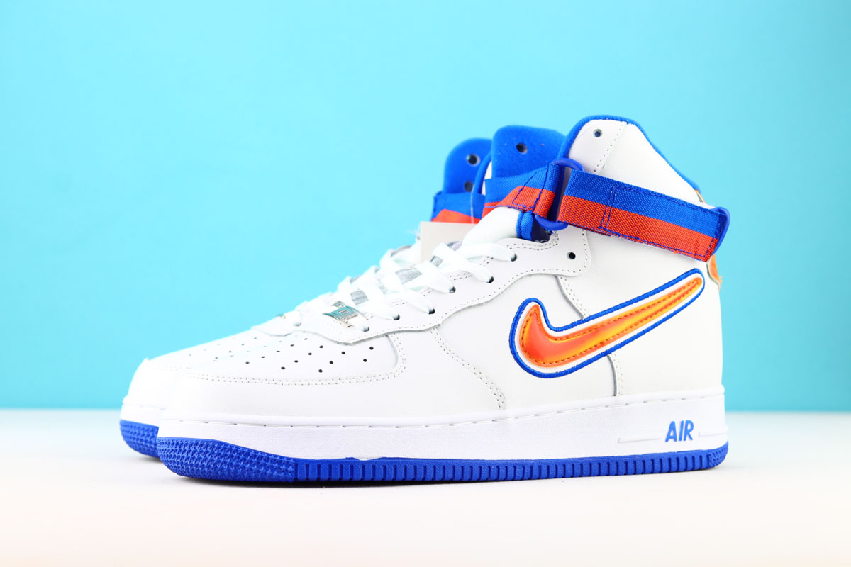 Part of Nike’s “For the Love of the Game” NBA Collection, they’ve designed a special edition Air Force 1 High for New York Knicks fans.Dressed in a White, Team Orange, and Game Royal color scheme. This Nike Air Force 1 High features a White tumbled leather upper with Orange and Royal Blue accents including a two-tone ankle strap. Finishing off the design is the series signature logo branded heel tab.