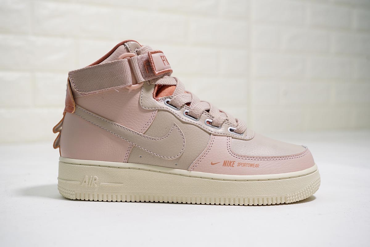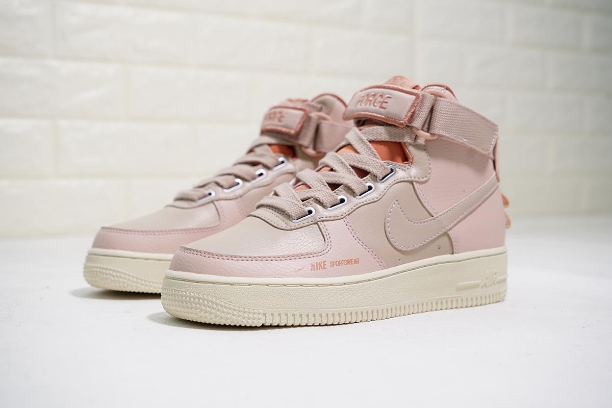 Having imported a tech-y, “Utility”-style aesthetic to many of their classic models over the last few months, it was only a matter of time until Nike gave the Air Force 1 High a rugged makeover. That time has arrived, as a two-pack of modified Air Force 1 Highs have now surfaced: a white/black and a soft pink/rose gold. Both pairs keep the shoe’s original bulky, high-cut aesthetic and leather upper intact, but add a cornucopia of interesting embellishments: a large wavy heel tab adorns both pairs, and the throat is modified as well with a raised eyestay, metal eyelets, and extra-thick flat laces. New-age branding is present too, with a bold “FORCE” hit appearing on the front of the strap, the tongue tags turned inside-out to show care information, and a small Nike Sportswear hit on the lateral forefoot. For a finishing pop of OG style — and a nod to the genesis of Force — retro cream accents appear on the midsole of both pairs and the swoosh of the white/black colorway.