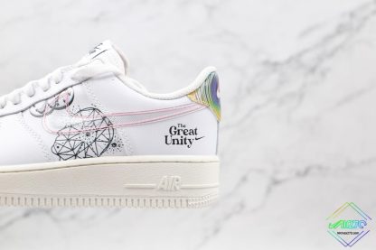 This offering of the Nike Air Force 1 sports a classic all-White color palette detailed with special graphics on the lateral and medial side panels. Transparent Swooshes on the sides, holographic “NIKE AIR” branded heels, “The Great Unity” stamped on the lateral heel, iridescent lace dubraes with Pink branded insoles completes the design.