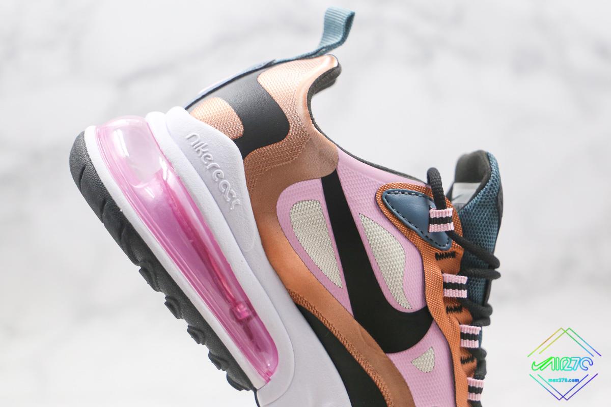 This Nike Air Max 270 React comes highlighted with Beige mesh across the base with synthetic detailing that uses Pink and Bronze. Following we have Black on the Swoosh logos, Pink placed within the Air Max unit along with Bronze outlines. Completing the look is a White React cushioned midsole and a Black rubber outsole.