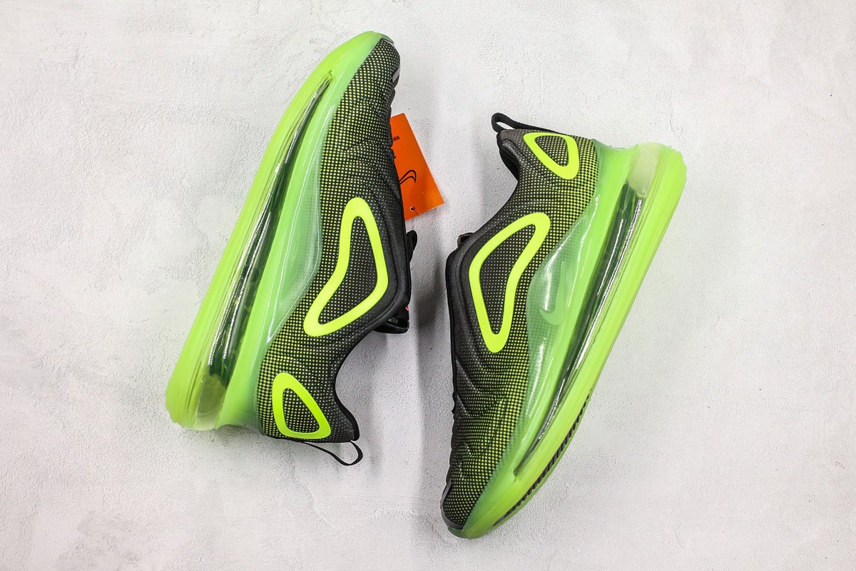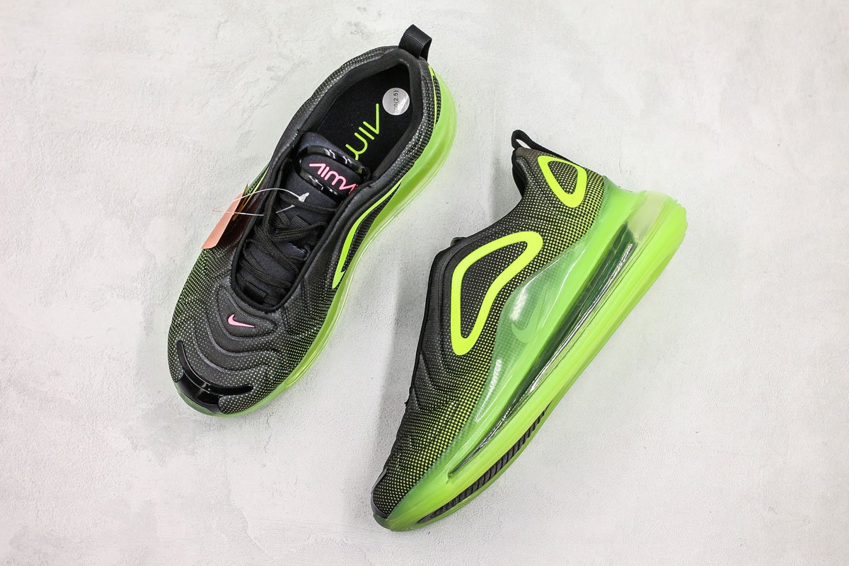 The brand new AM720 is possibly one of the most unique Swoosh silhouettes to date, but the Nike Air Max 720 Neon Black takes the cake as the most eye catching. Featuring a futuristic look that seems to take inspiration from organic life.