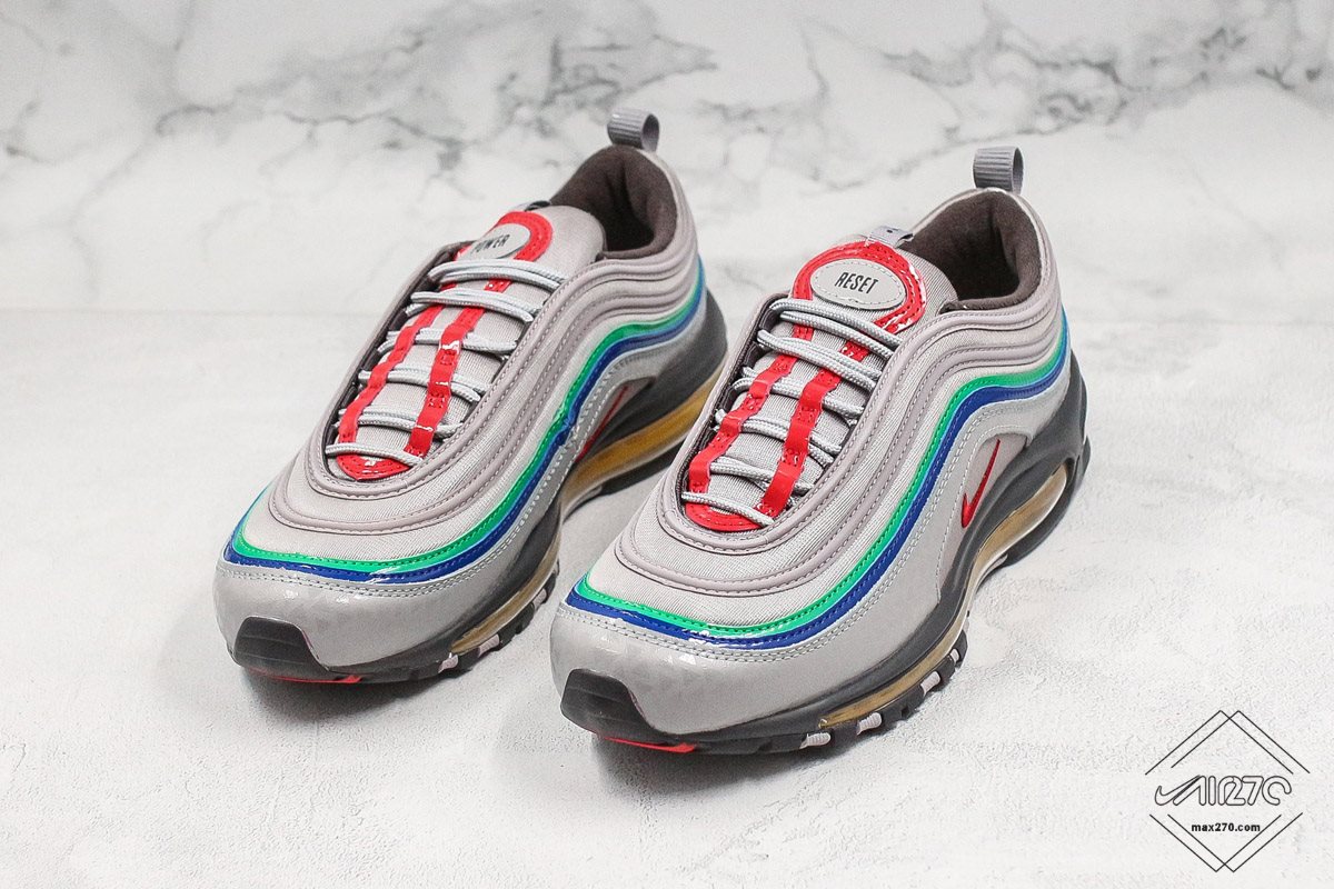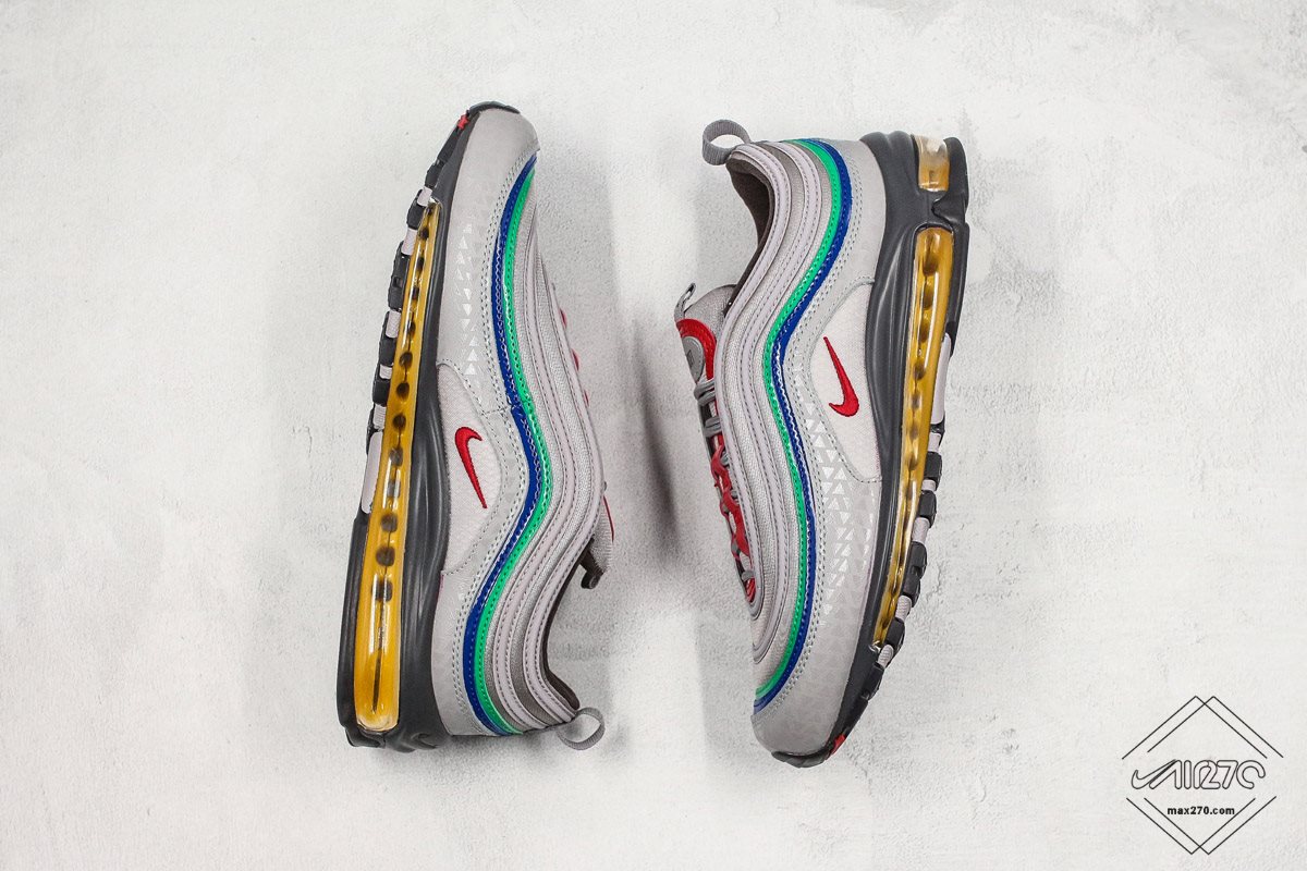 This nostalgic offering of the Nike Air Max 97 features a Light Grey mesh upper with matching leather overlays as as a nod to the system’s controller. Its colorful Green, Blue, Red, and Yellow, buttons are used as accents throughout the shoe.