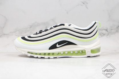 Originally designed by Christian Tresser, Air Max 97 takes inspiration from the Japanese bullet train, resulting in their smooth and aerodynamic appearance. Featuring a full-length Air Unit, it creates a complete feeling of walking on Air.What is effectively a reverse of the more notable Black/Volt colorway, the Air Max 97 is return in a scheme blindingly white accented by neon tones in an execution that mimics the strobes of downtown city life. Smooth leathers and intersecting molds cover the upper in smooth leathers with textural mesh adding contrast by way of the model’s signature layers. Iconography follows suit, sitting in contrast along a divergent backdrop while the patented green tone takes home within the confines of the air bubble and through the lowermost piping across the profile.