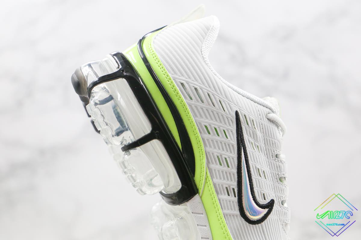 The Nike Air VaporMax 360 revolutionizes the Air Max silhouette once again with modern style and high performance. The lightweight upper presents a half-bootie tongue construction with grey and white tones that form a striped design pattern captured on the midfoot and silver overlays at the forefoot. What stands out the most on this shoe is the Volt green mudguard, tongue, and throat overlay, along with the iridescent silver Swoosh trimmed with thick black thread. The crystal clear VaporMax cushioning unit underneath the foot is a nod to futuristic running technology from the innovative brand.