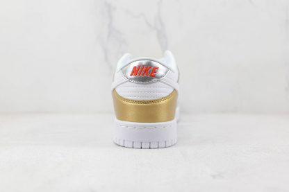 The use of gold and silver is nothing new as far as Nike is concerned. But rarely do the two come together — or, rather, clash — as they do atop this upcoming women’s exclusive Dunk Low. Revealed by leakers just weeks back, the colorway leans on simplicity to make its metals work. White builds out much of the foundation, including the tooling, mid-panel, lace unit, and collar. The Swoosh, too, outfits in said neutral as it sweeps across the side, simultaneously splitting the ankle flap’s silver and gold portions. A similar dual-toned finish outfits the toe, which effectively backlights the gilded dubrae. Enjoy an official look at this colorway below.
