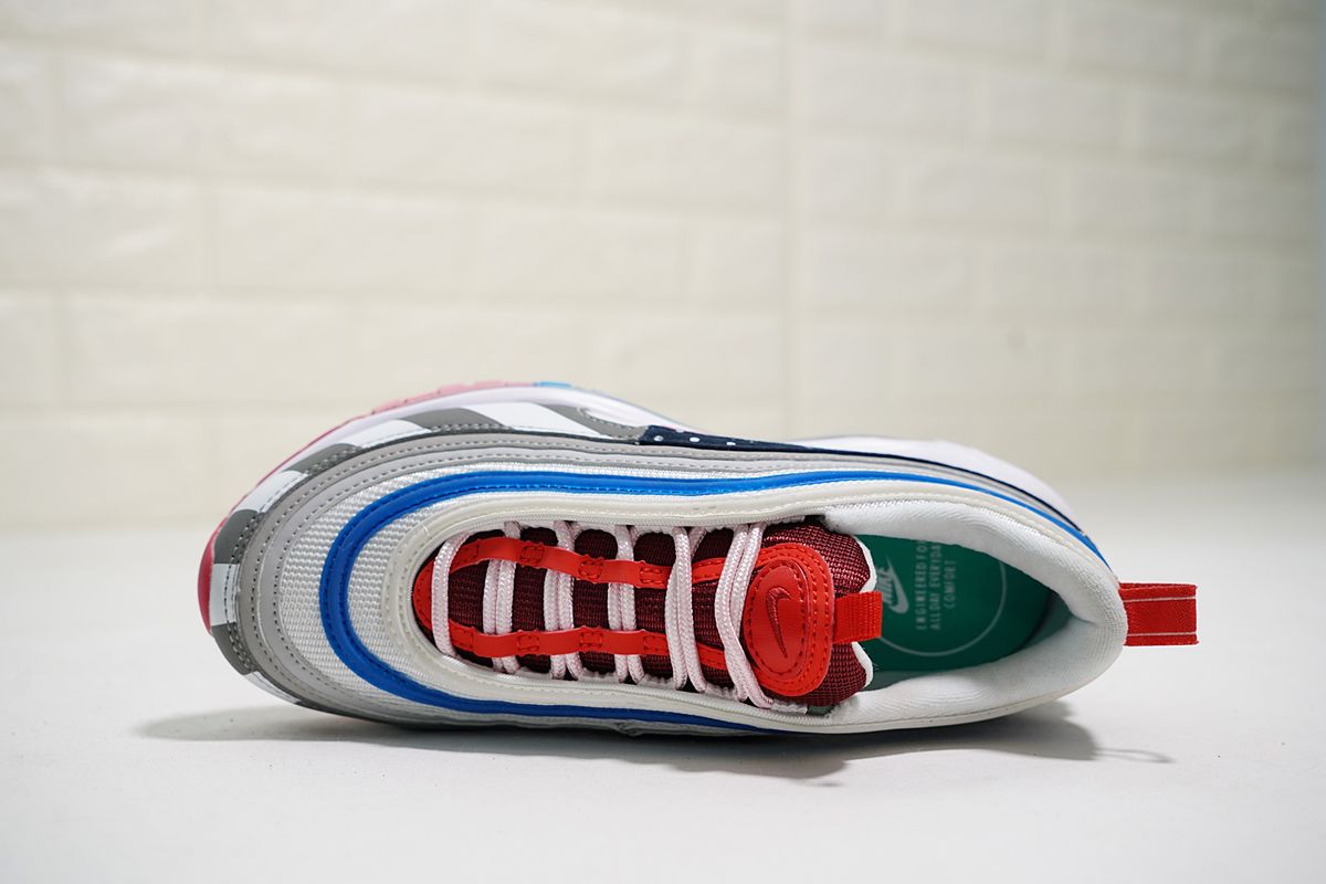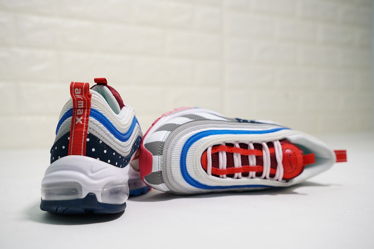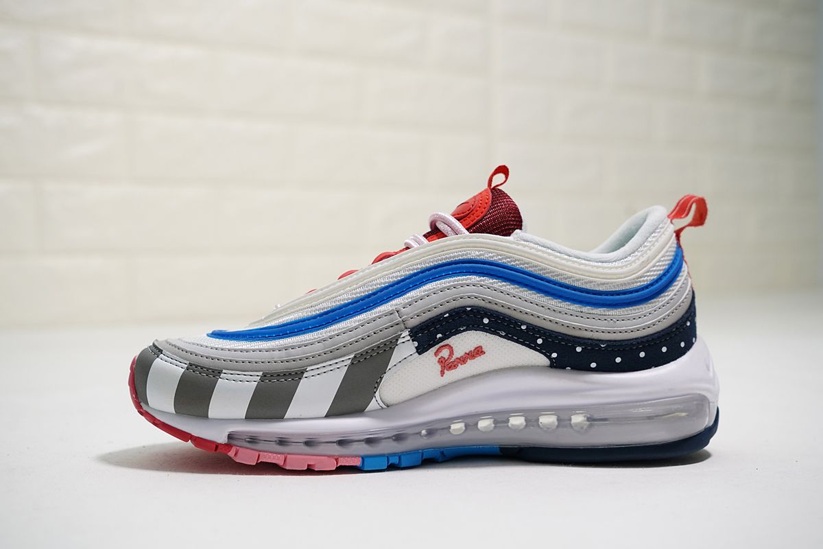 Dressed in a White and Pure Platinum color scheme. This Parra Nike Air Max 97 features a patchwork-like upper that covers the mudguard and heel in mix patterns. It features a White and Grey upper accented with Blue and Red shades highlighted with mismatched striped and polka dot panels for a nice fashionable style.