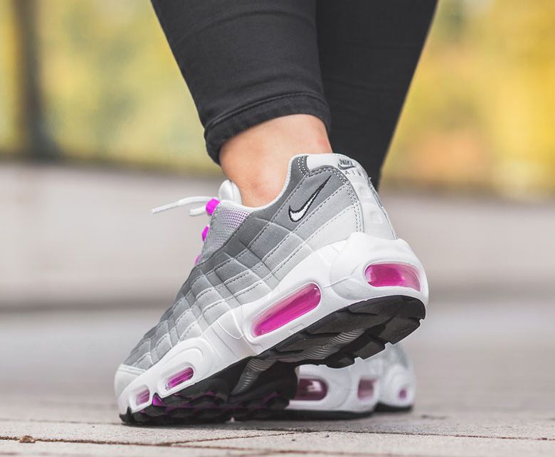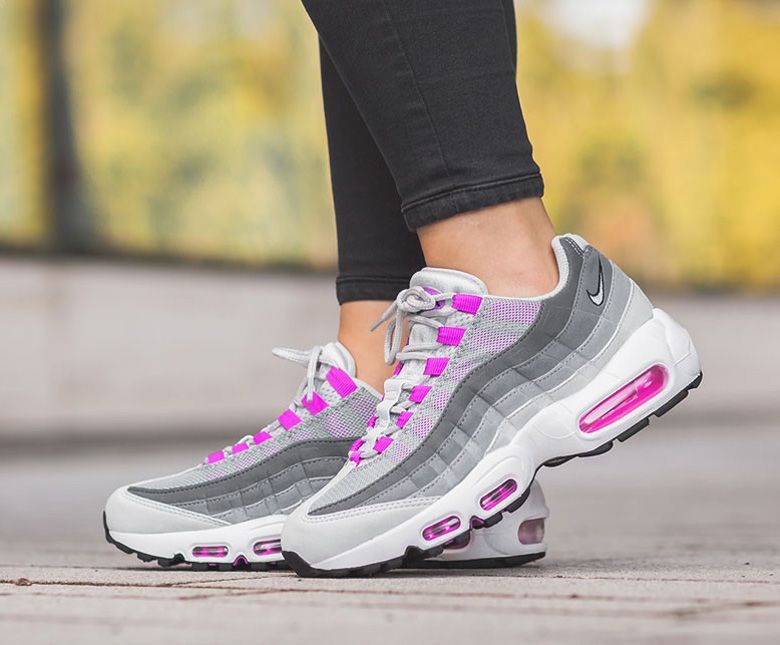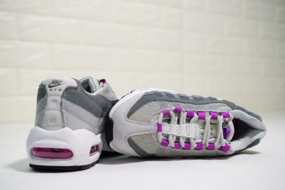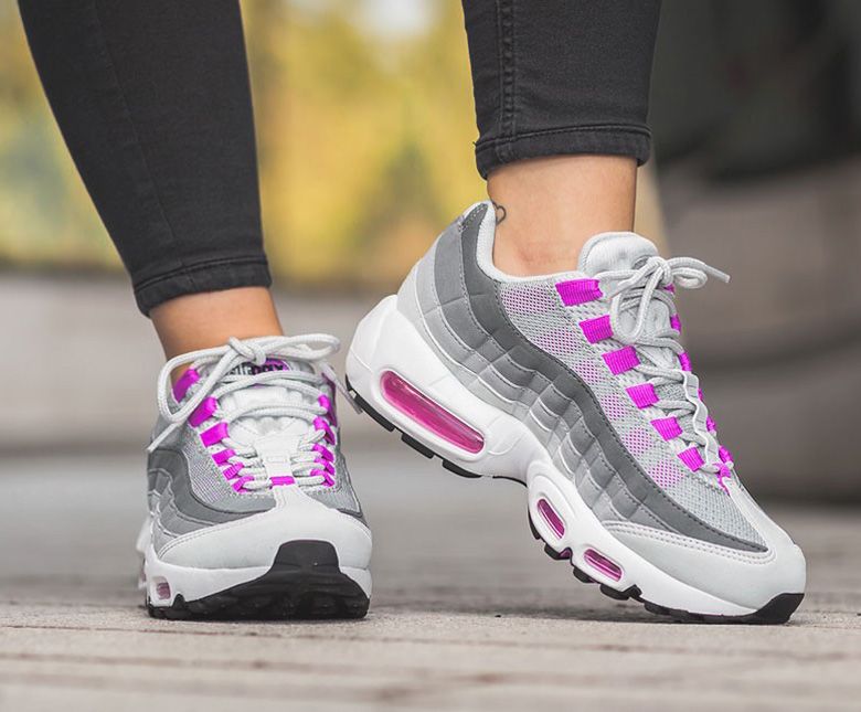 Hyper Violet Max 95 Composed of its signature construction of suede, mesh and synthetics, the distinctive side panels are rendered in dark and light grey tones for a gradient theme, while the defining shades are prominent on its lace stays and signature visible air bubble unit in its contrasting white rubber sole.